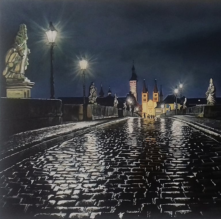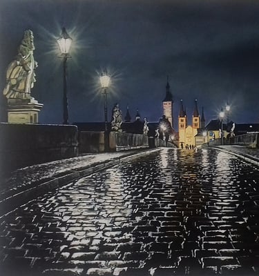 Mein Erstwerk der Alten Mainbrücke. Trotz der verwendeten Farben hat es den Charakter eines Schwarzweiß-Bildes.