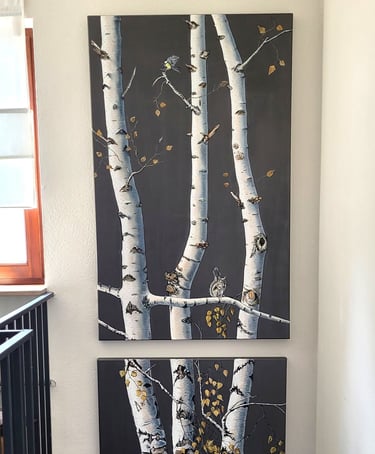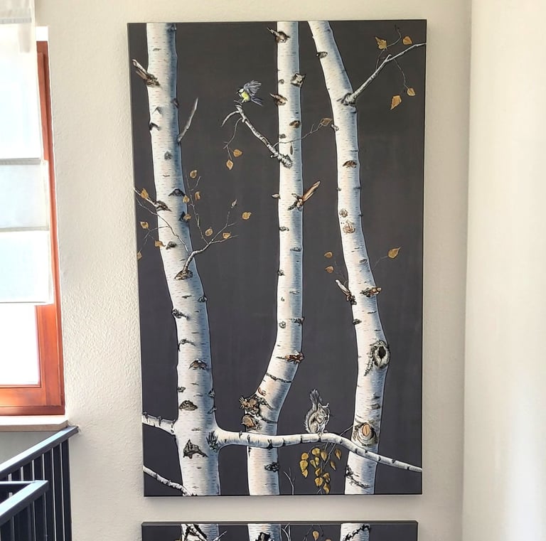 Birken, wunderschöne Bäume mit ihrer einzigartigen Struktur inspirierten mich zu dieser Wandmalerei in meiner eignen Wohnung. Mit vielen feinen Details enstand so eine ungewöhnliche Wanddekoration.